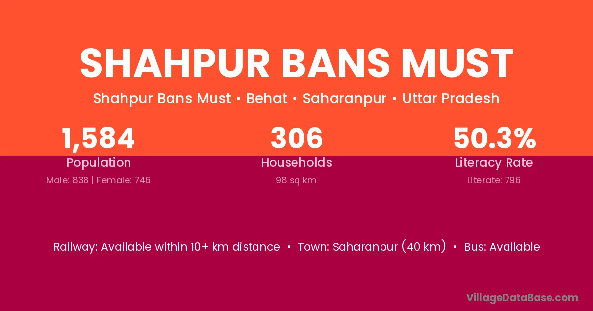 Saharanpur (40 km) is the nearest town to Shahpur Bans Must village for major economic activities and is located approximately 40 km away.
