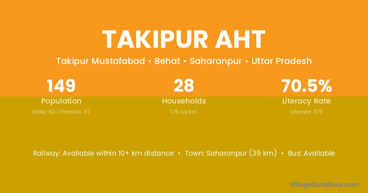 Saharanpur (39 km) is the nearest town to Takipur Aht village for major economic activities and is located approximately 39 km away.