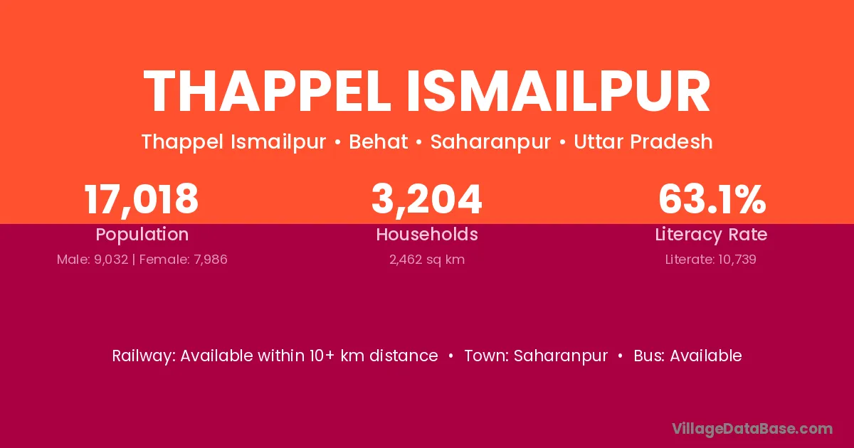 Thappel Ismailpur village has a total population of 17,018 people, of which 9,032 are males and 7,986 are females.