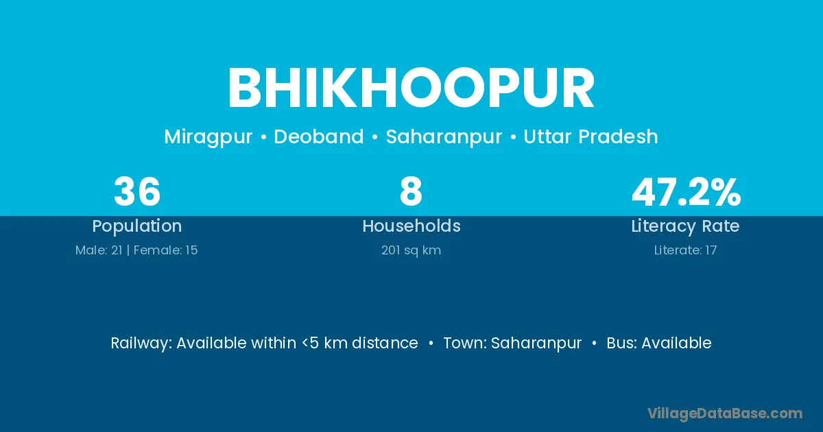 Bhikhoopur village has a total population of 36 people, of which 21 are males and 15 are females.