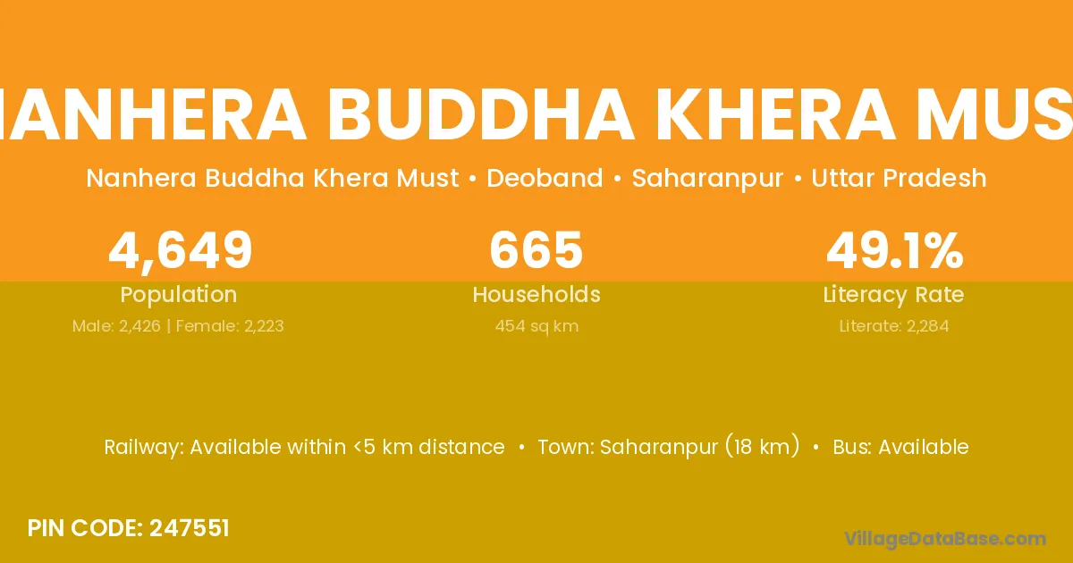 Saharanpur (18 km) is the nearest town to Nanhera Buddha Khera Must village for major economic activities and is located approximately 18 km away.