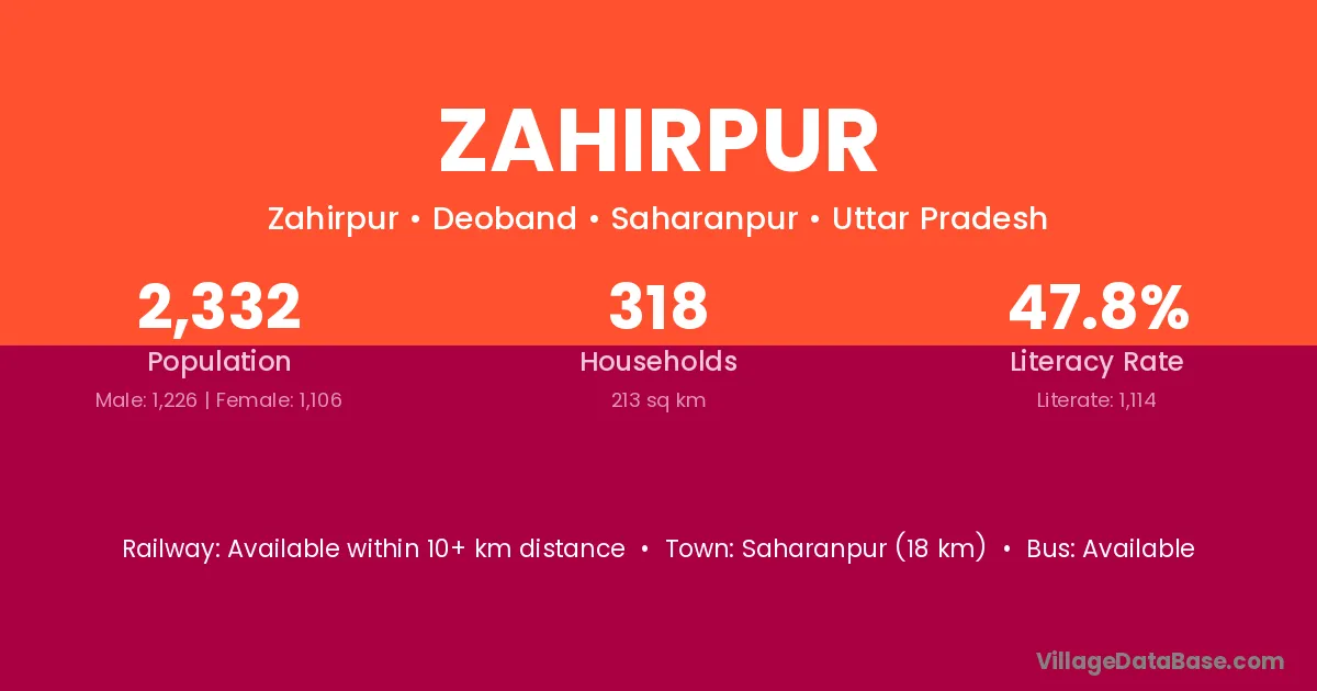 Saharanpur (18 km) is the nearest town to Zahirpur village for major economic activities and is located approximately 18 km away.