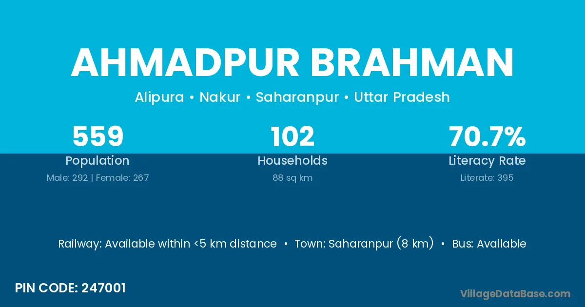 Saharanpur (8 km) is the nearest town to Ahmadpur Brahman village for major economic activities and is located approximately 8 km away.