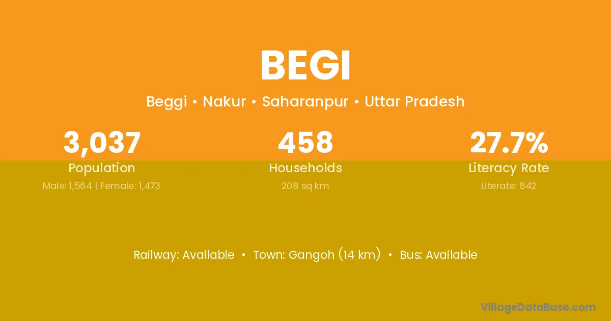 Gangoh (14 km) is the nearest town to Begi village for major economic activities and is located approximately 14 km away.