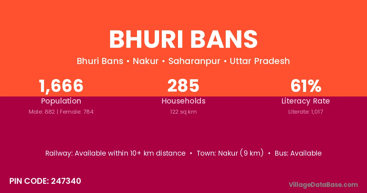 Nakur (9 km) is the nearest town to Bhuri Bans village for major economic activities and is located approximately 9 km away.