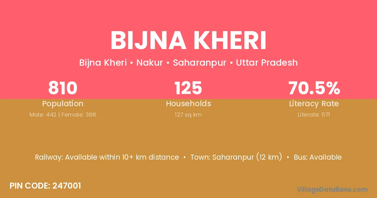 Saharanpur (12 km) is the nearest town to Bijna Kheri village for major economic activities and is located approximately 12 km away.