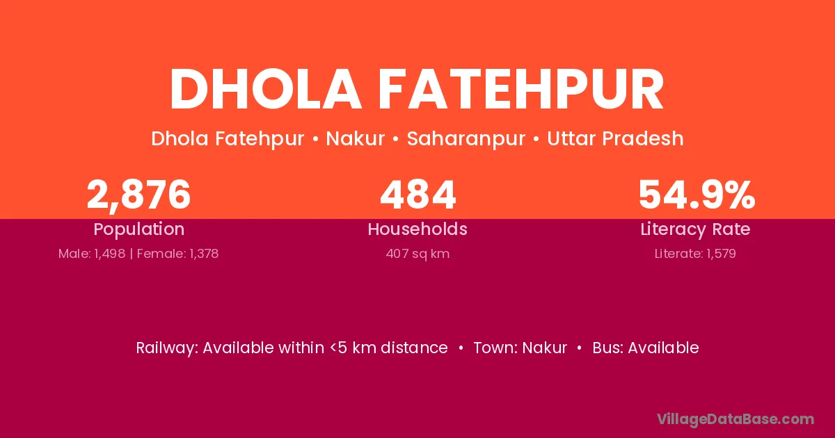 Dhola Fatehpur village has a total population of 2,876 people, of which 1,498 are males and 1,378 are females.