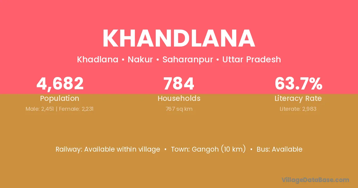 Gangoh (10 km) is the nearest town to Khandlana village for major economic activities and is located approximately 10 km away.