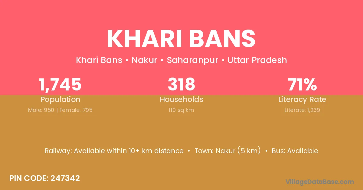 Nakur (5 km) is the nearest town to Khari Bans village for major economic activities and is located approximately 5 km away.