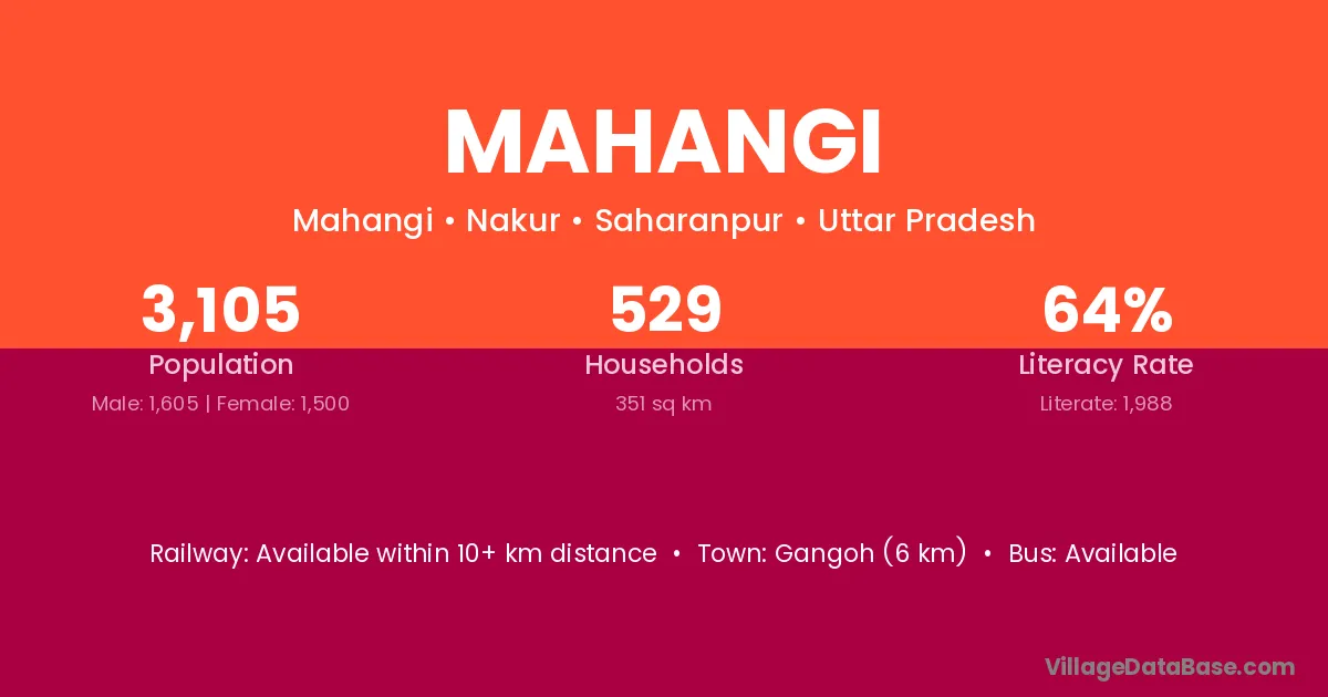 Gangoh (6 km) is the nearest town to Mahangi village for major economic activities and is located approximately 6 km away.