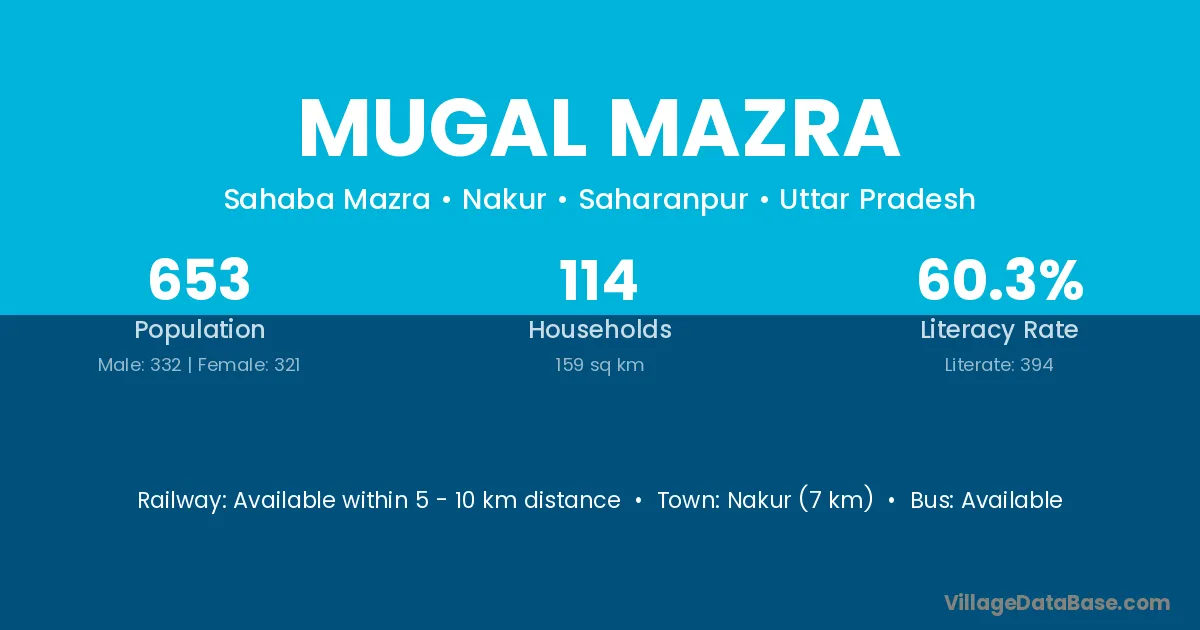 Nakur (7 km) is the nearest town to Mugal Mazra village for major economic activities and is located approximately 7 km away.