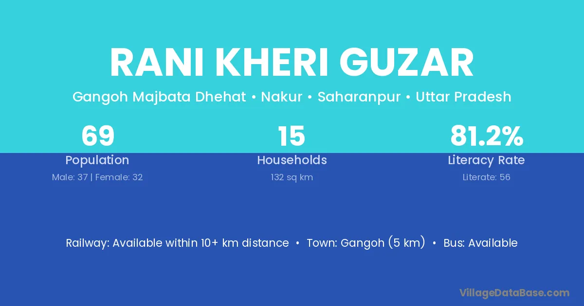 Gangoh (5 km) is the nearest town to Rani Kheri Guzar village for major economic activities and is located approximately 5 km away.