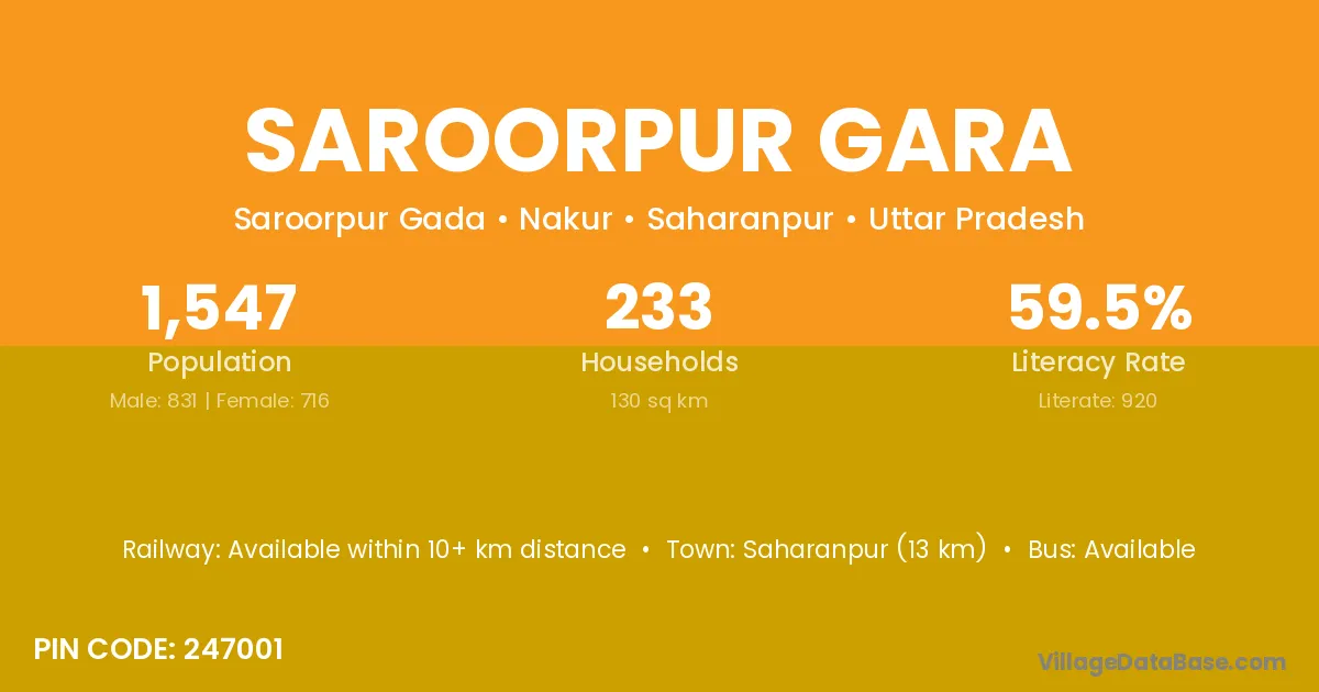 Saroorpur Gara village has a total population of 1,547 people, of which 831 are males and 716 are females.