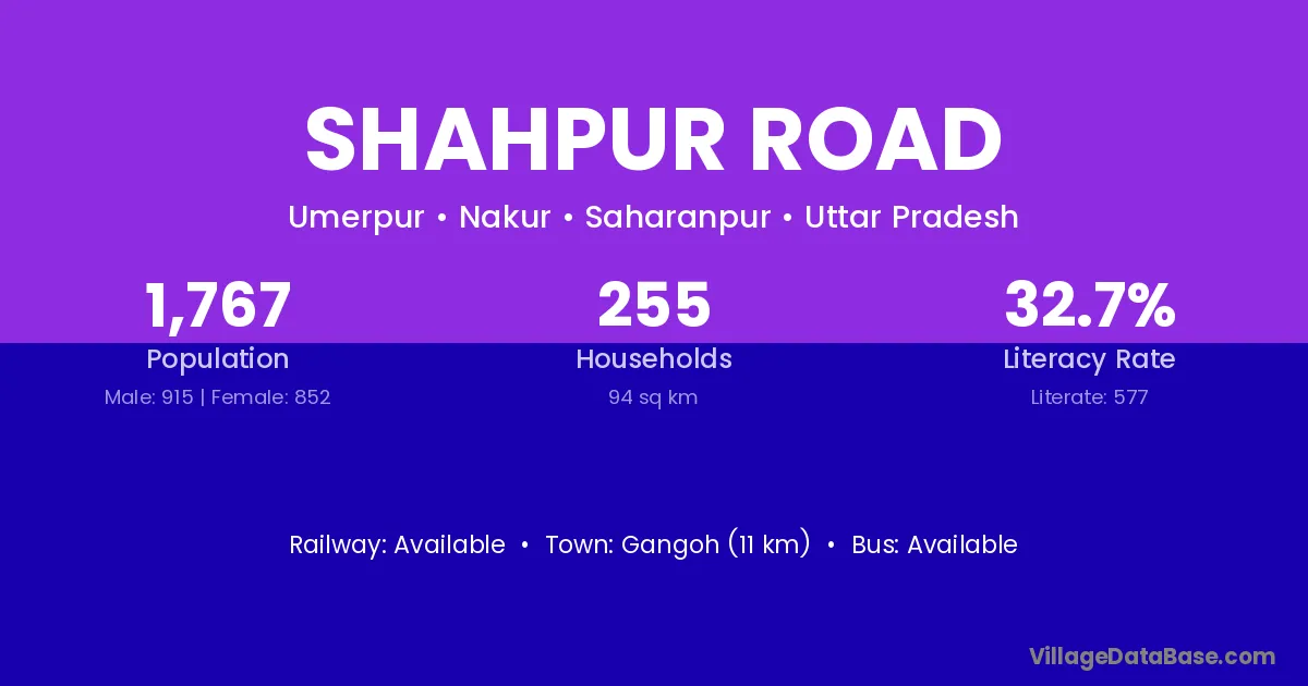 Gangoh (11 km) is the nearest town to Shahpur Road village for major economic activities and is located approximately 11 km away.