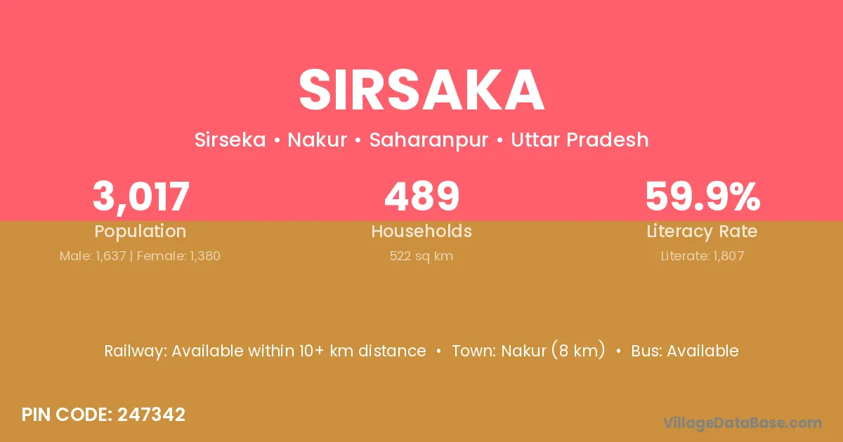 Nakur (8 km) is the nearest town to Sirsaka village for major economic activities and is located approximately 8 km away.