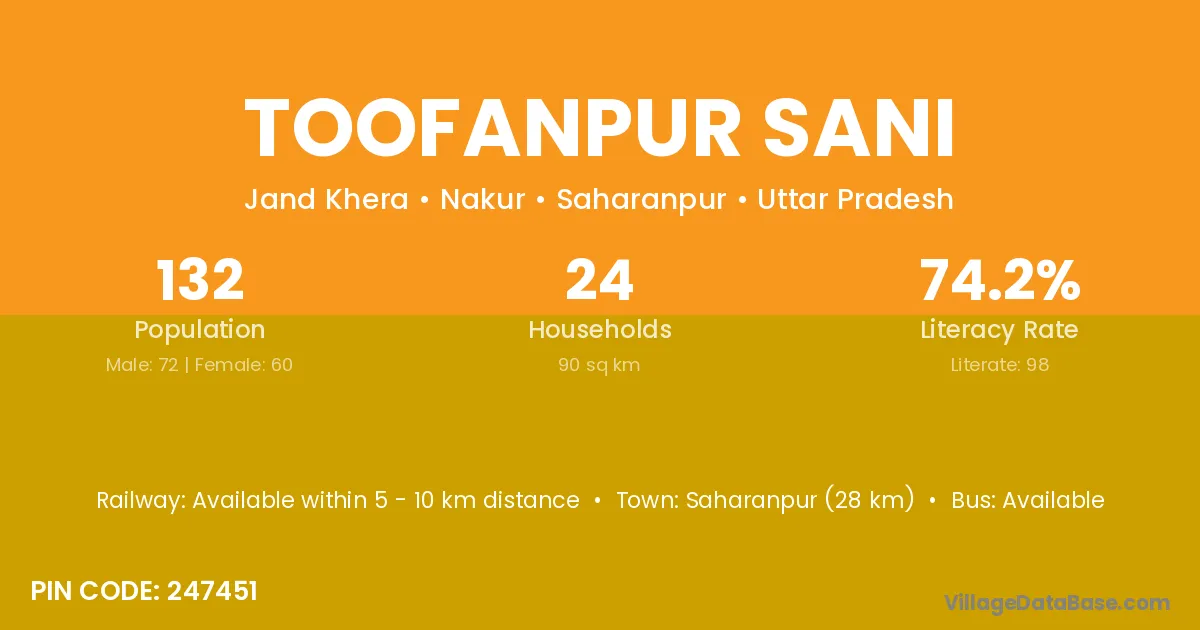 Toofanpur Sani village has a total population of 132 people, of which 72 are males and 60 are females.