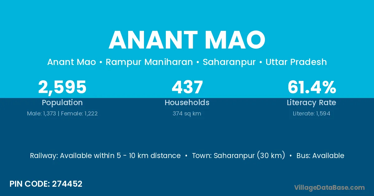Saharanpur (30 km) is the nearest town to Anant Mao village for major economic activities and is located approximately 30 km away.