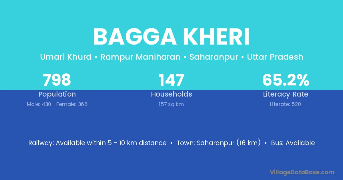 Saharanpur (16 km) is the nearest town to Bagga Kheri village for major economic activities and is located approximately 16 km away.