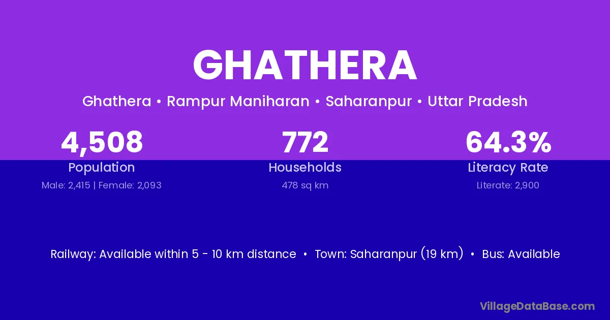 Saharanpur (19 km) is the nearest town to Ghathera village for major economic activities and is located approximately 19 km away.
