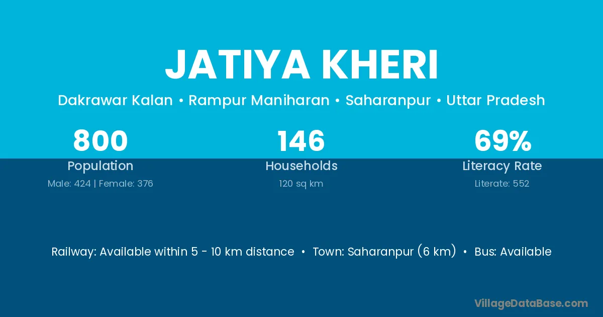 Saharanpur (6 km) is the nearest town to Jatiya Kheri village for major economic activities and is located approximately 6 km away.