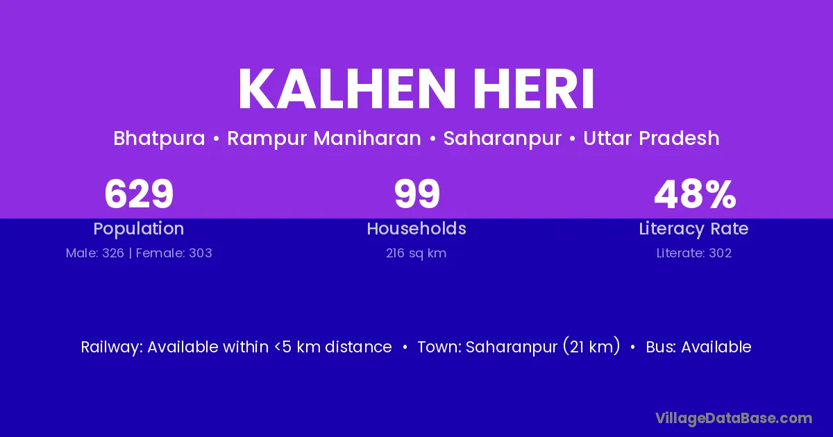 Saharanpur (21 km) is the nearest town to Kalhen Heri village for major economic activities and is located approximately 21 km away.