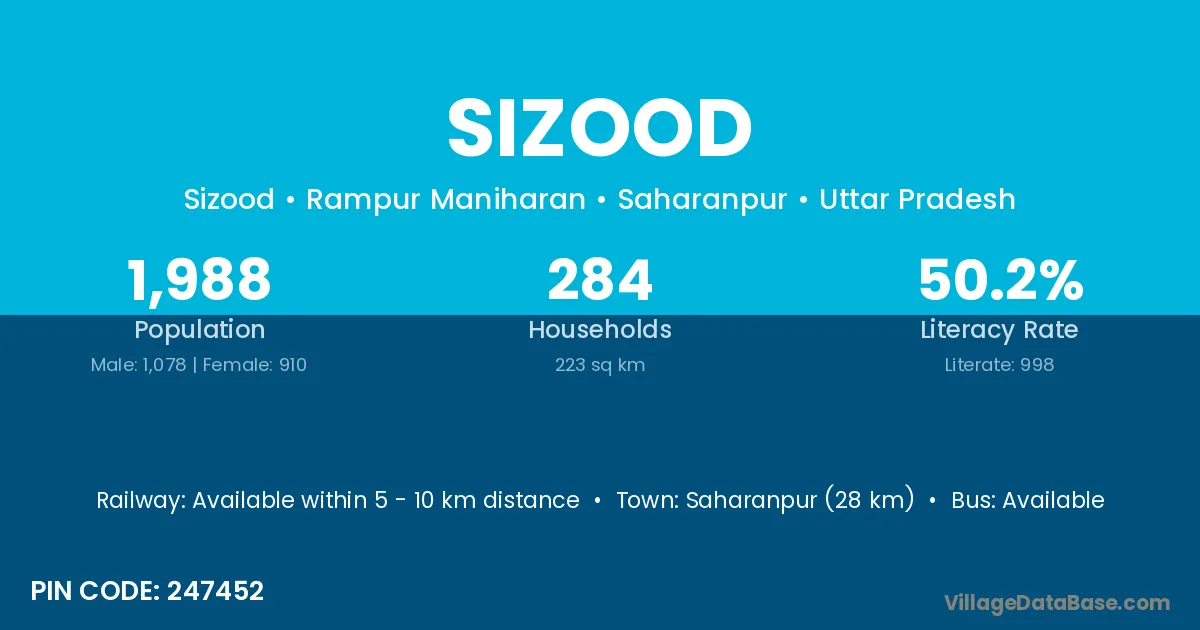 Saharanpur (28 km) is the nearest town to Sizood village for major economic activities and is located approximately 28 km away.