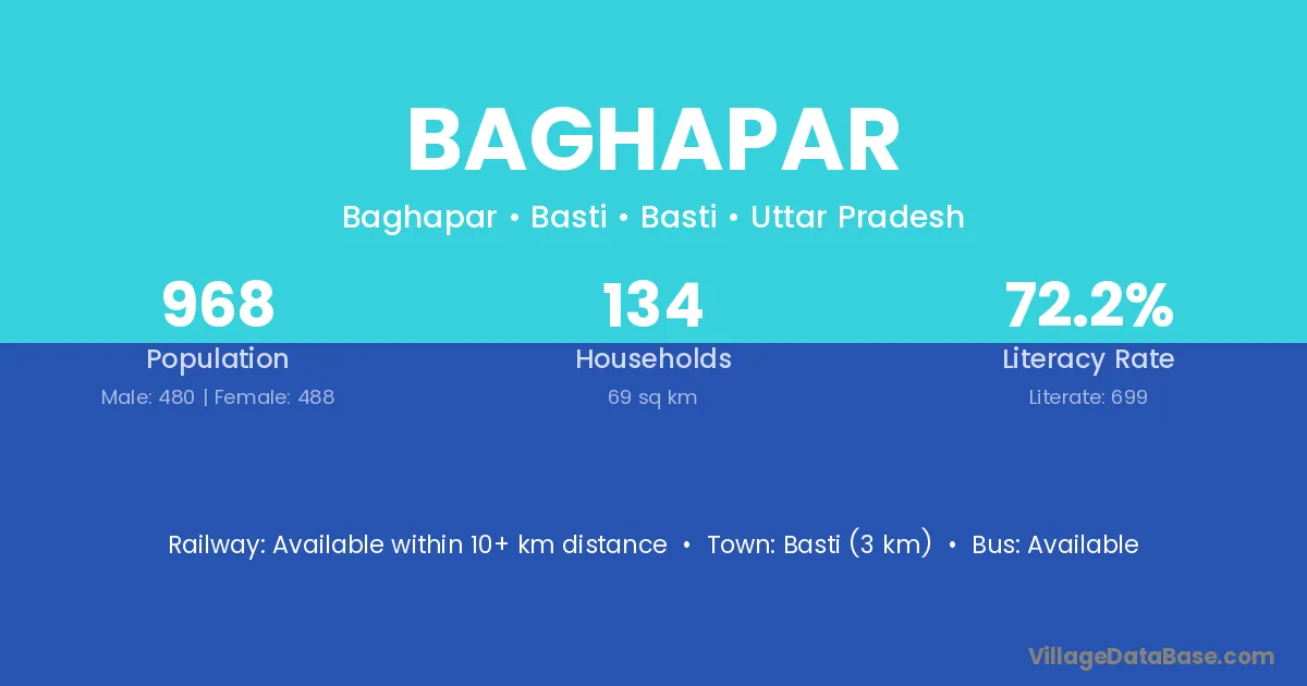 Sant Kabir Nagar (22 km) is the nearest town to Baghapar village for major economic activities and is located approximately 22 km away.
