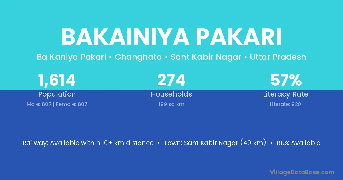 Sant Kabir Nagar (40 km) is the nearest town to Bakainiya Pakari village for major economic activities and is located approximately 40 km away.