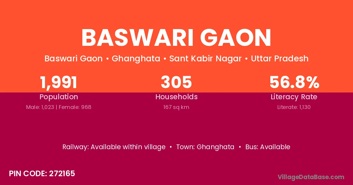 Baswari Gaon village has a total population of 1,991 people, of which 1,023 are males and 968 are females.