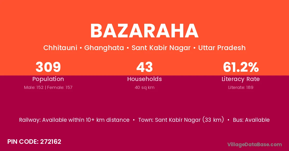 Sant Kabir Nagar (33 km) is the nearest town to Bazaraha village for major economic activities and is located approximately 33 km away.