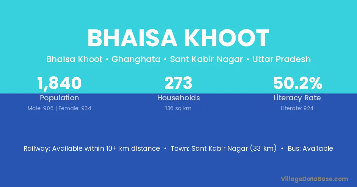 Sant Kabir Nagar (33 km) is the nearest town to Bhaisa Khoot village for major economic activities and is located approximately 33 km away.