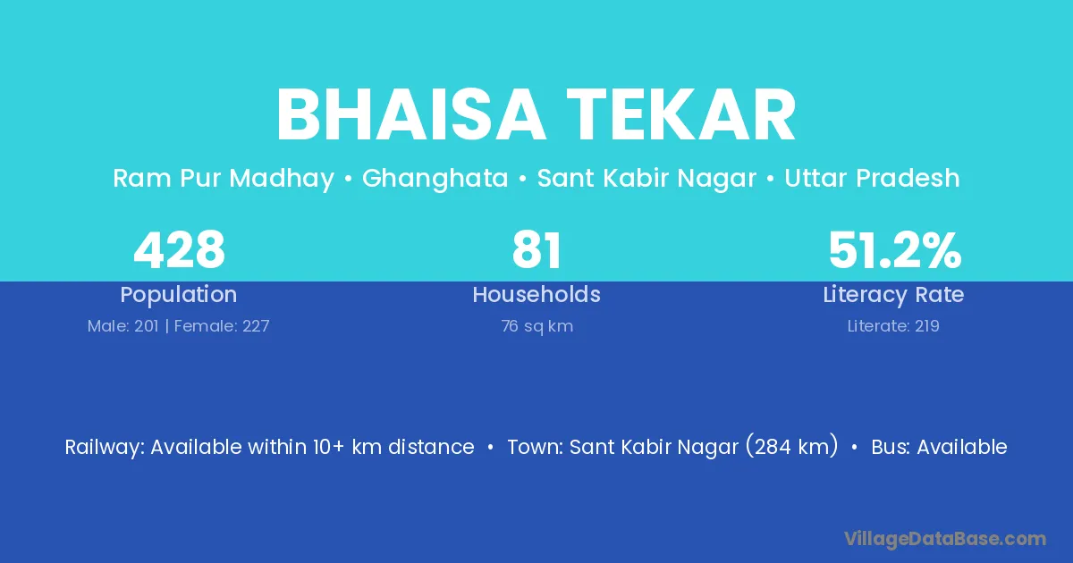 Sant Kabir Nagar (284 km) is the nearest town to Bhaisa Tekar village for major economic activities and is located approximately 284 km away.