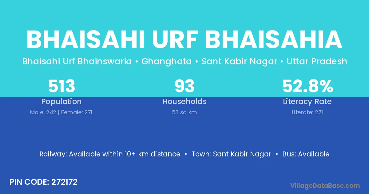Bhaisahi Urf Bhaisahia village has a total population of 513 people, of which 242 are males and 271 are females.