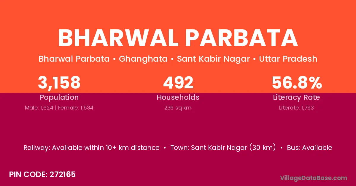 Sant Kabir Nagar (30 km) is the nearest town to Bharwal Parbata village for major economic activities and is located approximately 30 km away.