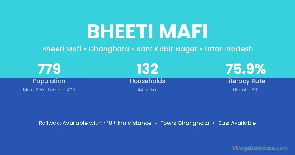 Bheeti Mafi village has a total population of 779 people, of which 370 are males and 409 are females.