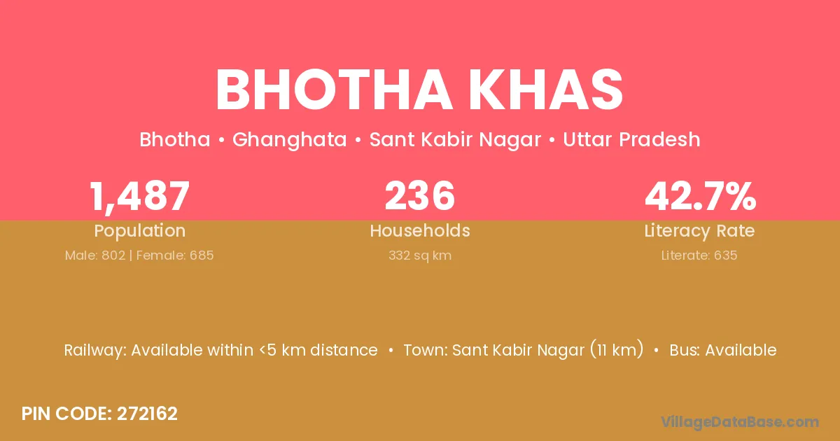 Sant Kabir Nagar (11 km) is the nearest town to Bhotha Khas village for major economic activities and is located approximately 11 km away.