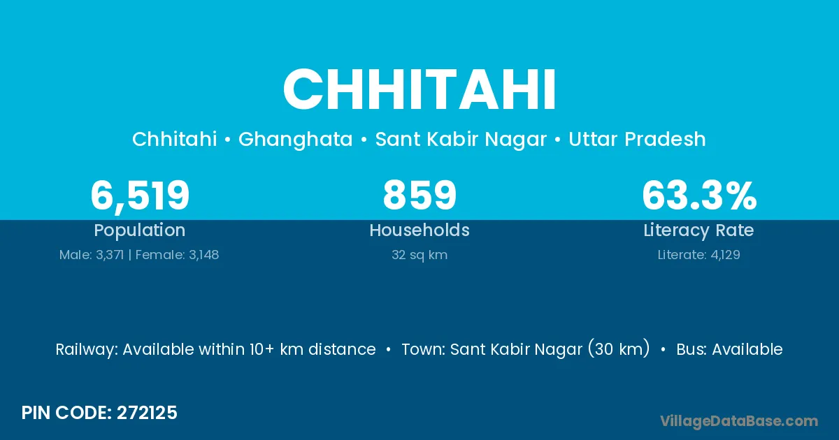 Sant Kabir Nagar (30 km) is the nearest town to Chhitahi village for major economic activities and is located approximately 30 km away.
