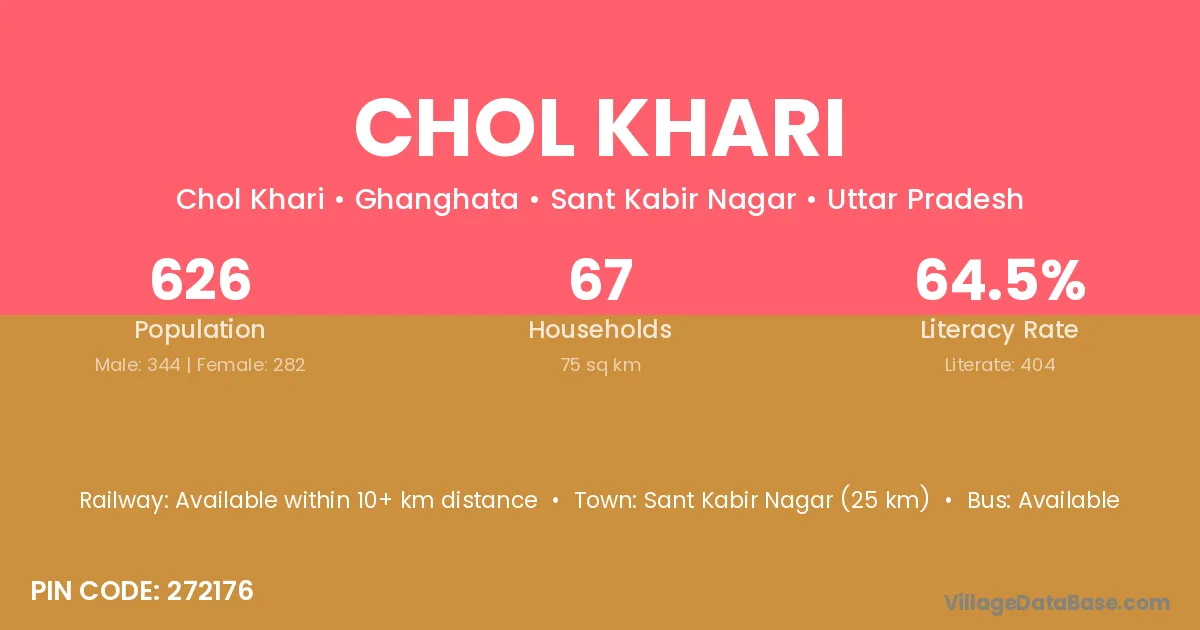 Sant Kabir Nagar (25 km) is the nearest town to Chol Khari village for major economic activities and is located approximately 25 km away.