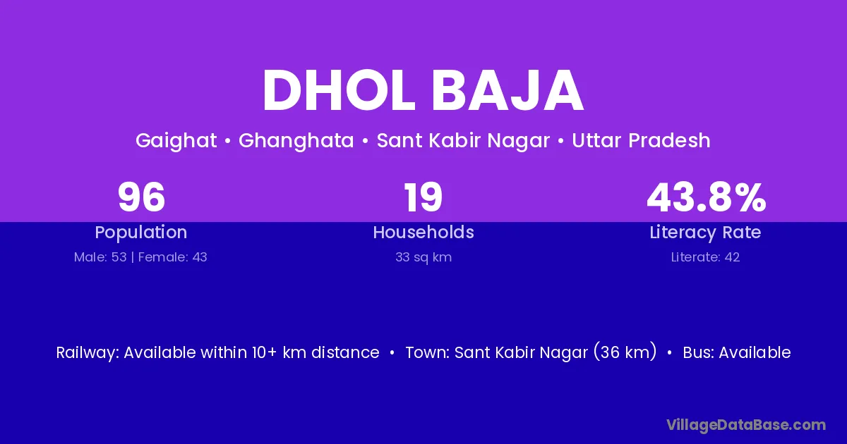 Sant Kabir Nagar (36 km) is the nearest town to Dhol Baja village for major economic activities and is located approximately 36 km away.