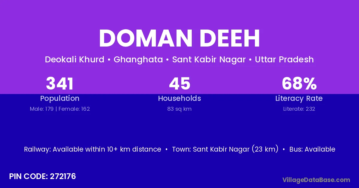 Sant Kabir Nagar (23 km) is the nearest town to Doman Deeh village for major economic activities and is located approximately 23 km away.