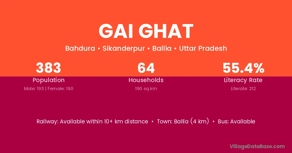 Sant Kabir Nagar (42 km) is the nearest town to Gai Ghat village for major economic activities and is located approximately 42 km away.