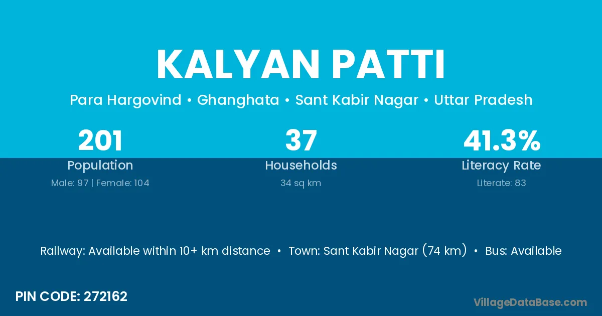 Sant Kabir Nagar (74 km) is the nearest town to Kalyan Patti village for major economic activities and is located approximately 74 km away.