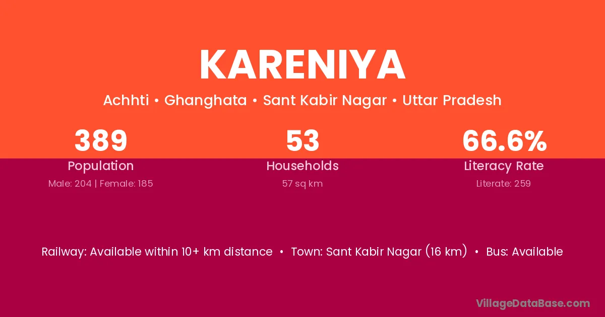 Sant Kabir Nagar (16 km) is the nearest town to Kareniya village for major economic activities and is located approximately 16 km away.