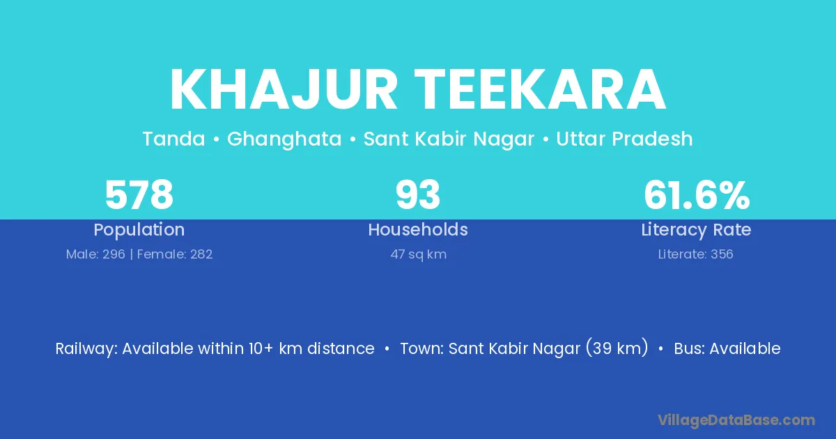 Sant Kabir Nagar (39 km) is the nearest town to Khajur Teekara village for major economic activities and is located approximately 39 km away.