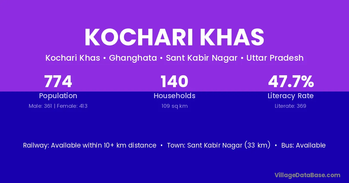 Sant Kabir Nagar (33 km) is the nearest town to Kochari Khas village for major economic activities and is located approximately 33 km away.