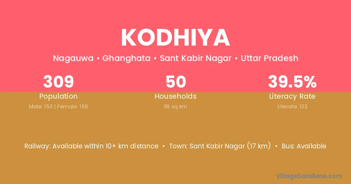 Sant Kabir Nagar (17 km) is the nearest town to Kodhiya village for major economic activities and is located approximately 17 km away.