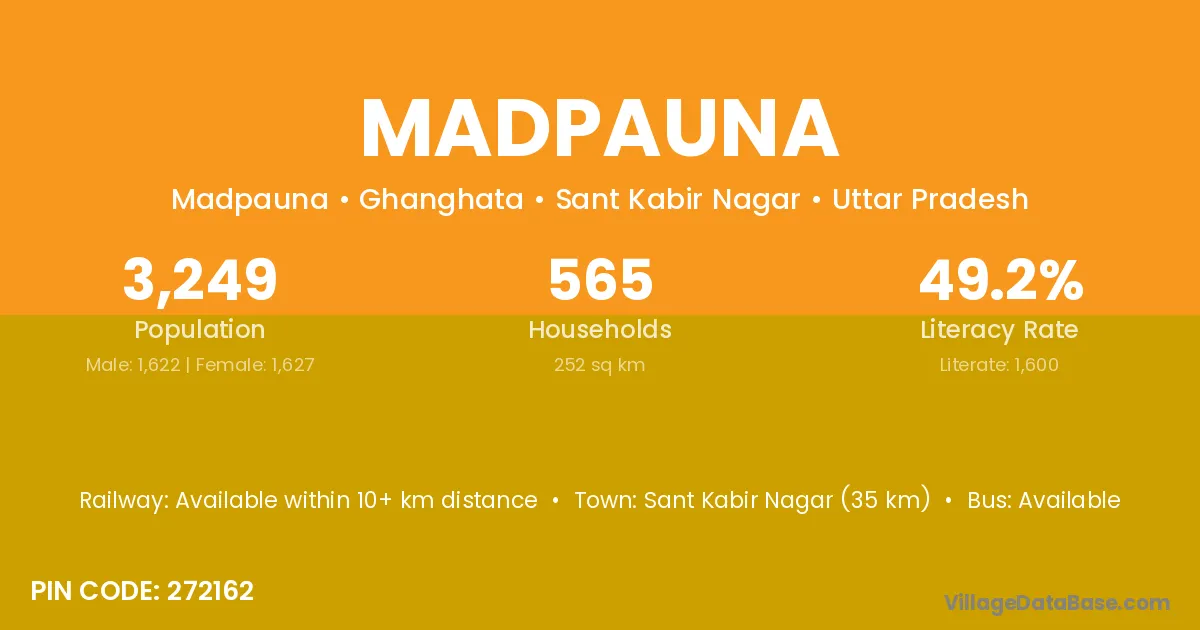 Sant Kabir Nagar (35 km) is the nearest town to Madpauna village for major economic activities and is located approximately 35 km away.