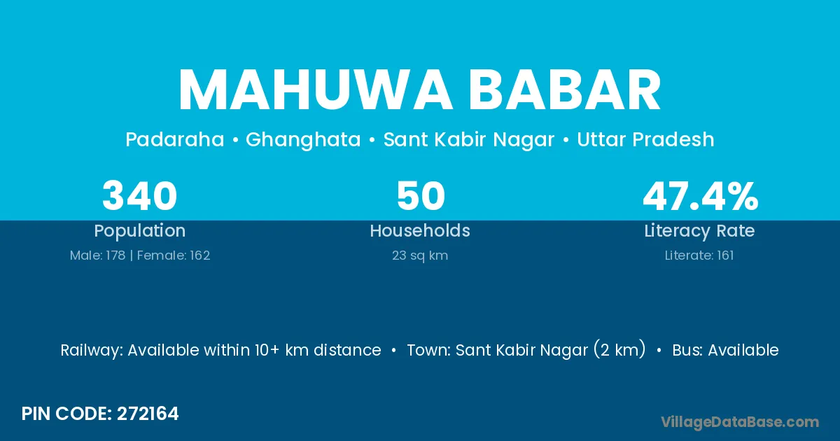 Sant Kabir Nagar (2 km) is the nearest town to Mahuwa Babar village for major economic activities and is located approximately 2 km away.