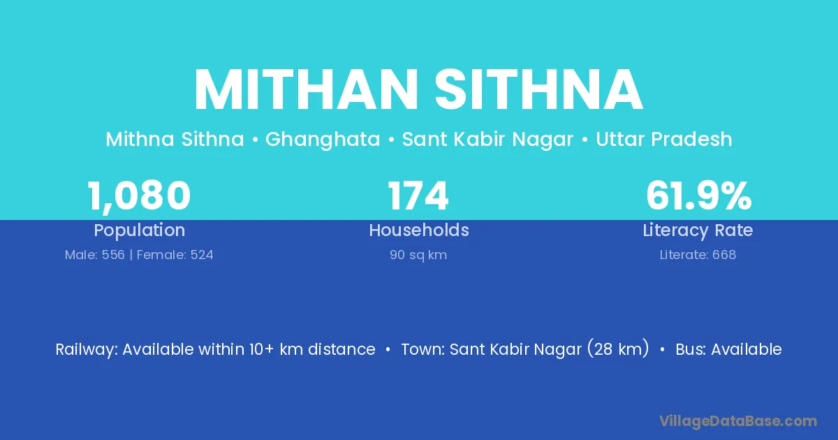 Sant Kabir Nagar (28 km) is the nearest town to Mithan Sithna village for major economic activities and is located approximately 28 km away.