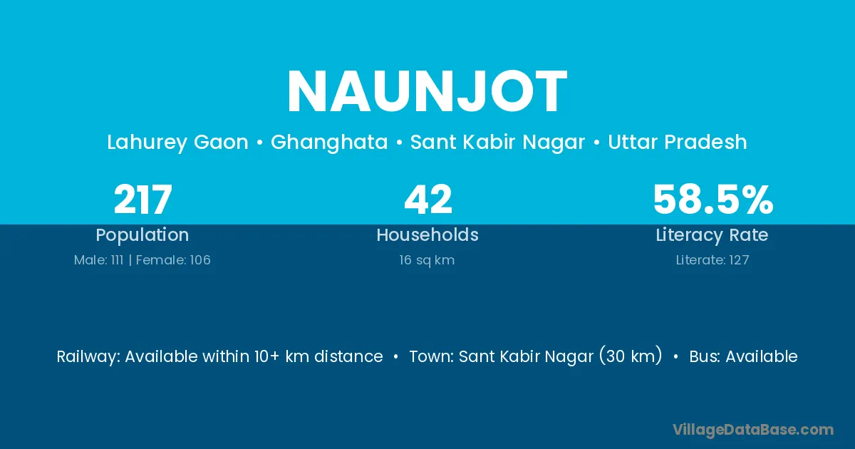 Sant Kabir Nagar (30 km) is the nearest town to Naunjot village for major economic activities and is located approximately 30 km away.